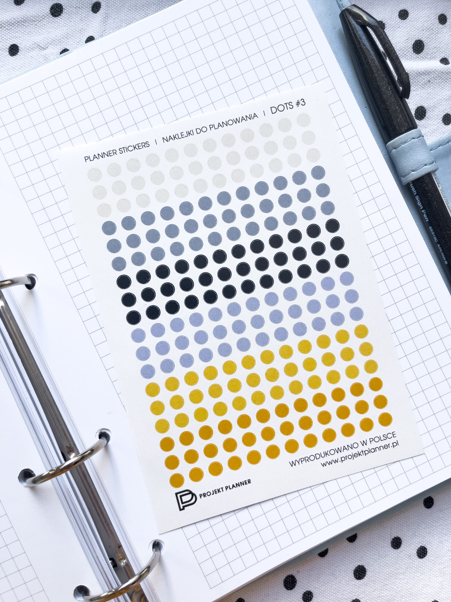 Arkusz w formacie A6 składa się z 216 naklejek kółek o średnicy ~5mm, które idealnie mieszczą się w obszarze zadrukowanej kratki zeszytowej, a przede wszystkim, pełnią funkcję uzupełniającą nasze wkłady kalendarzowe i plannerowe.